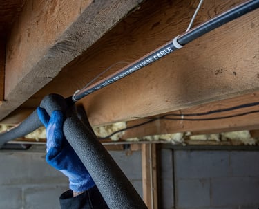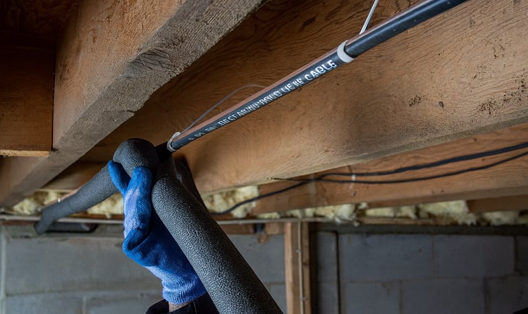 Protected exposed water lines with self-regulating heat tape and GFCI outlet upgrade. A winter-ready solution for freeze prevention.